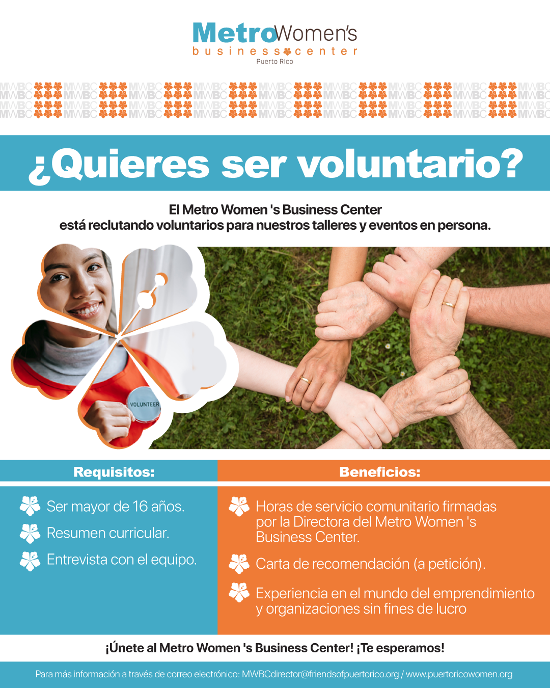 The Metro Women’s Business Center (MWBC) is recruiting volunteers for our future in-person workshops and events. As a part of Friends of Puerto Rico, the MWBC provides comprehensive training and resources for women entrepreneurs in the metropolitan area.